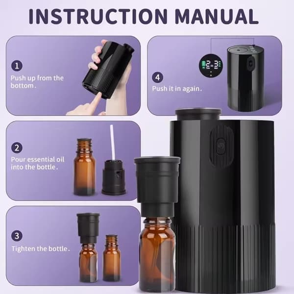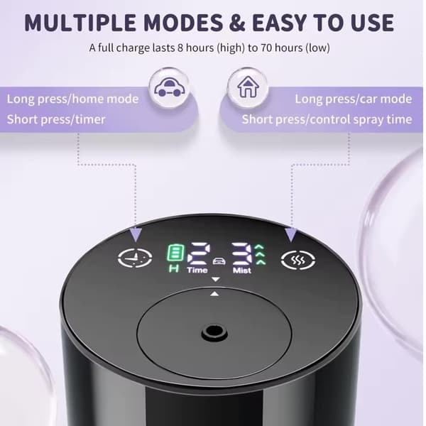 Powered by a rechargeable battery, this diffuser offers up to 8–70 hours of continuous use per charge. The eco-friendly, energy-efficient battery ensures lasting performance while supporting sustainable living. Simple to operate, it features an intuitive plug-and-play system—just add a few drops of oil-soluble essential oils, press the button, and let the soothing aroma fill your space.