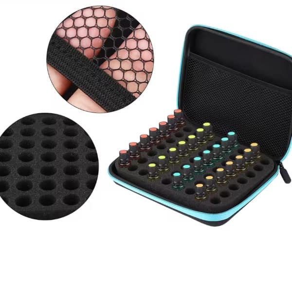 Crafted with premium materials, our large essential oil storage box comes in two main designs to suit your lifestyle and needs. The EVA hard shell case features a tough, shock-resistant exterior with 63 individual slots, keeping each bottle secure and upright. This lightweight and portable essential oil storage bag ensures your oils stay protected from leaks, cracks, and sunlight exposure, maintaining their quality and scent. Its compact design makes it perfect for home use, professional aromatherapy setups, or travel. Available in a variety of colors — Black, Purple, Blue, and Orange — this essential oil storage boxes combines functionality with a modern, stylish look.