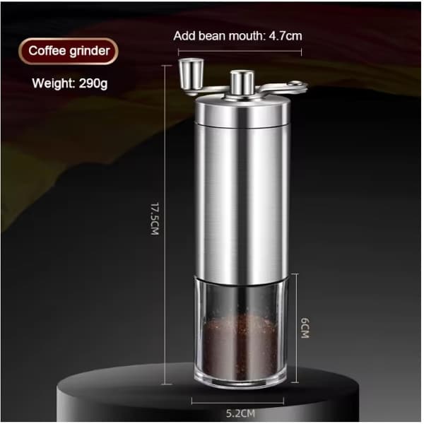 6-gear model: Holds 15–18g of coffee beans, and the glass jar stores up to 105g of ground coffee.