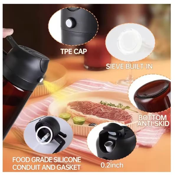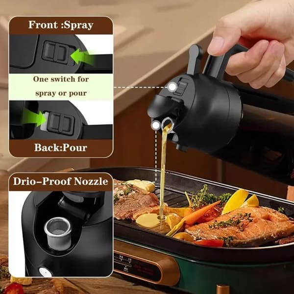 The 2-in-1 pour and spray mechanism makes this oil glass bottle dispenser easy to use for multiple cooking styles. Simply open the buckle to pour a smooth, even stream of oil, or press the spray nozzle to achieve a fine mist—ideal for coating salads, grilling meat, or adding a light touch of oil to your air fryer recipes. After the first use, press several times to remove air from the silica gel tube for an even spray.